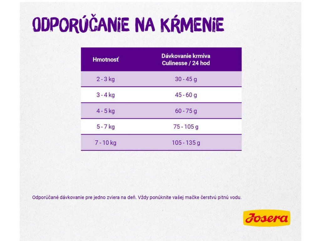 Josera Culinesse je kompletné krmivo s lahodným lososovým proteínom je ako stvorená pre náročné jazýčky. Vďaka svojej vyváženej receptúre je ľahko stráviteľná a výnimočne chutná. Vďaka nižšiemu obsahu tuku je ideálny pre dospelé mačky žijúce von aj vnútri.