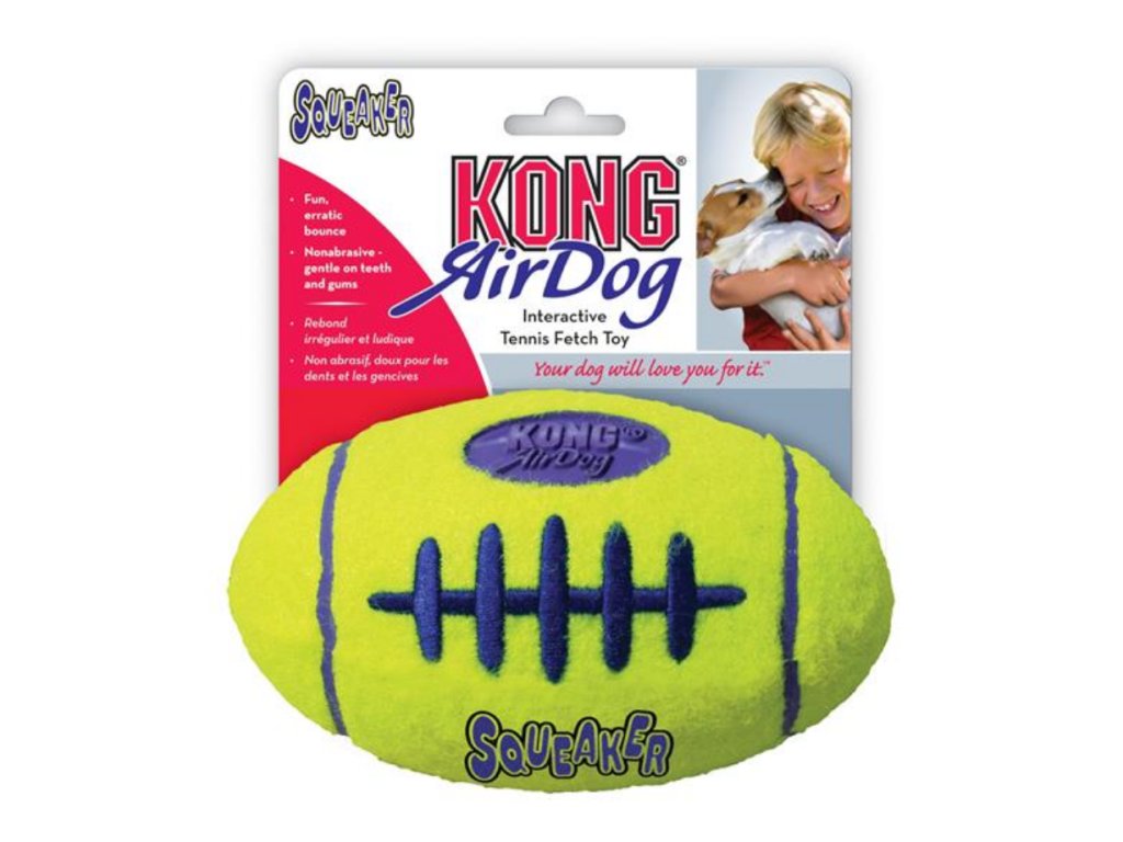KONG AirDog Squeaker Football kombinuje dve klasické hračky pre psy – tenisovú loptičku a pískatko –pre dokonalú hračku na aport. Neabrazívny vysoko kvalitný materiál neopotrebováva chrup psa. Nájdite obľúbený tvar AirDog vášho psa a zábava sa môže začať.